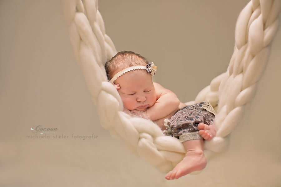 Diese süße Biene hatte ich vor langem schon im Studio fotografiert. Ganz lieb und entspannt hat sie die Momente genossen, eingekringelt wie in Mamas Bauch zu liegen oder in ihrem Bettchen sanft zu kuscheln. Wunderschöne Babybilder sind entstanden und bewahren somit die Erinnerung wunderbarer und einzigartiger Momente eines Neugeborenen mit 8 Tagen.